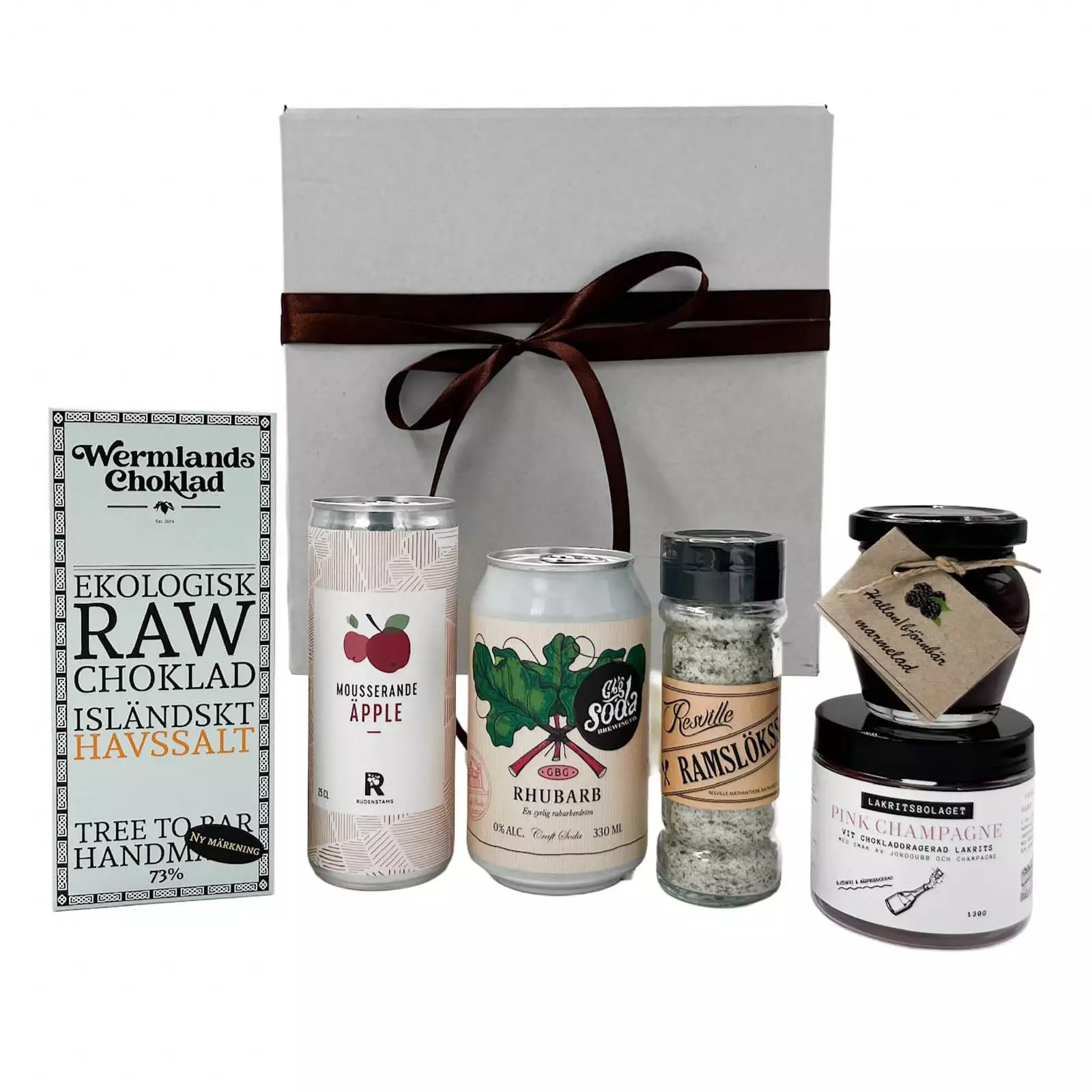 En present för den som uppskattar hållbarhet och äkta smaker. Här möts svenska delikatesser från olika delar av landet: rabarberläsk från Göteborg, mousserande äpple från Småland, hallon- & björnbärsmarmelad från Tidaholm, rawchoklad med isländskt havssalt från Arvika, pink champagne-lakrits från Skåne och ramslökssalt från Lidköping. Perfekt för den som vill ge bort något genomtänkt och närproducerat.
