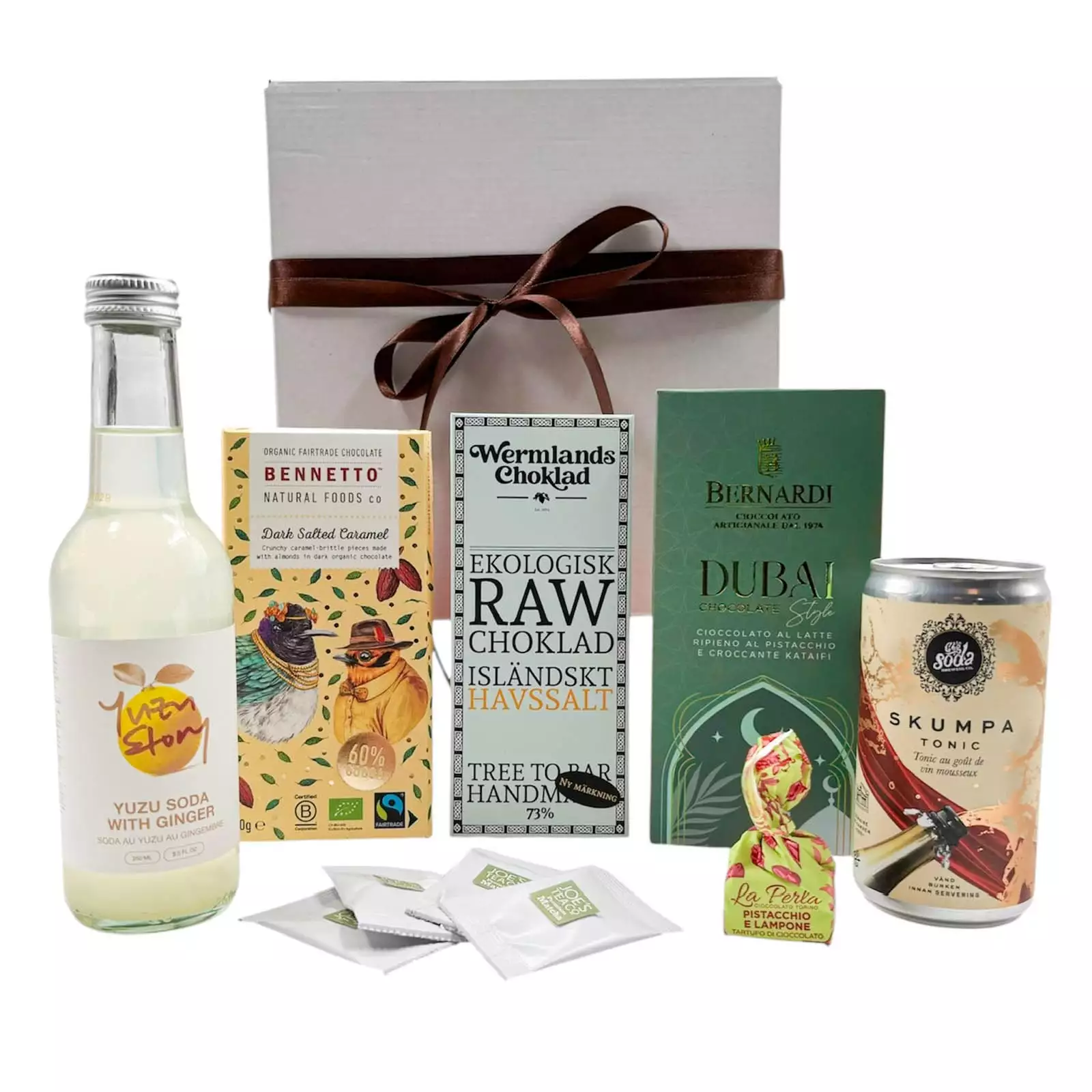 En elegant presentlåda som förenar trendiga smaker och bästsäljare. Den här presentlådan bjuder på den omtalade dubaichokladen, ekologisk matcha, sparkling yuzu med ingefära, salt karamell choklad, hallon- & pistagetryffel, bästsäljande Skumpa Tonic med guldskimmer och rawchoklad med havssalt.