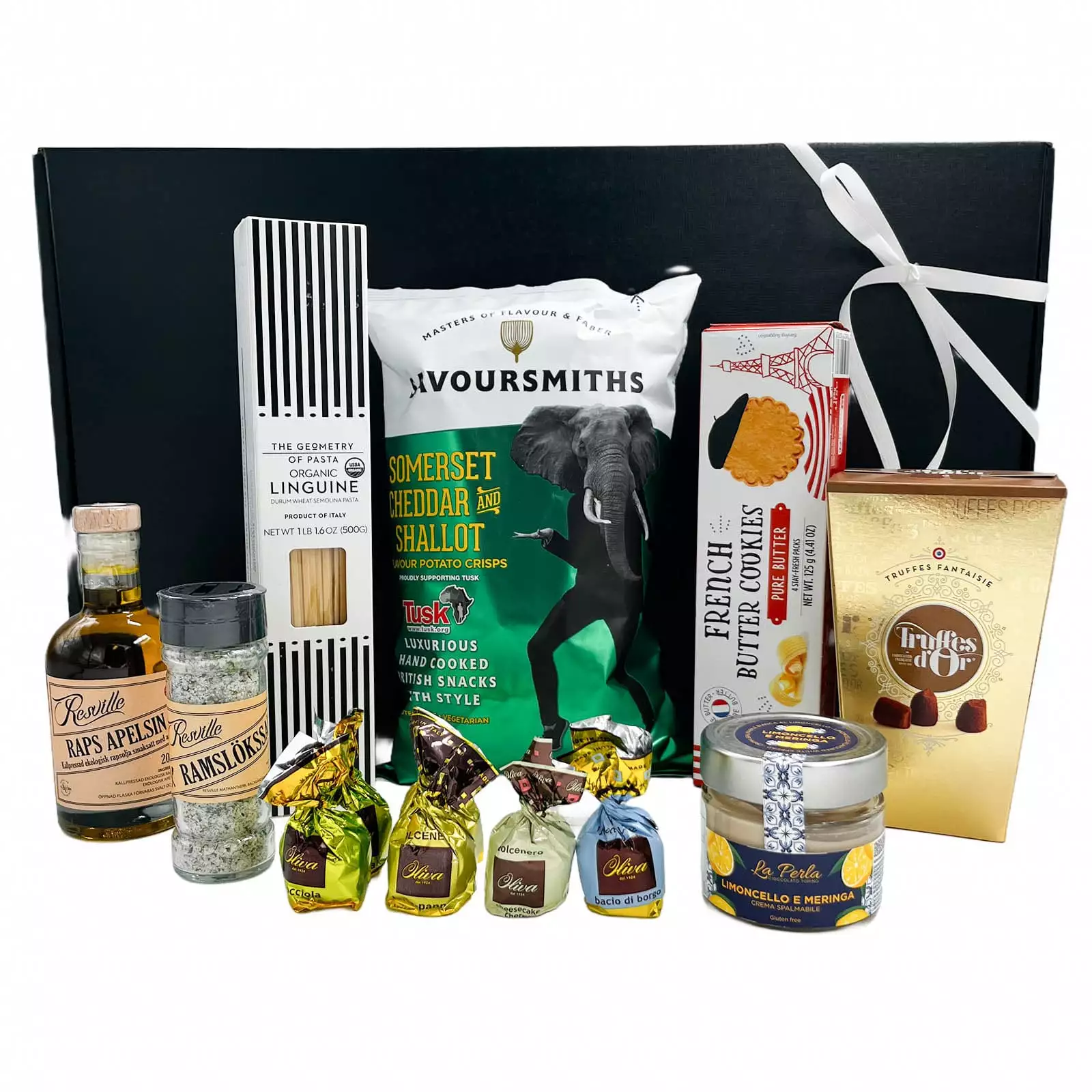 Stor delikatesslåda fylld med italiensk ekologisk pasta, svenska delikatesser, franska tryfflar, franska smörkakor, chips med cheddarsmak, chokladpraliner och en härlig limoncello- och maräng créme. Perfekt som gåva till mat- och chokladälskaren.