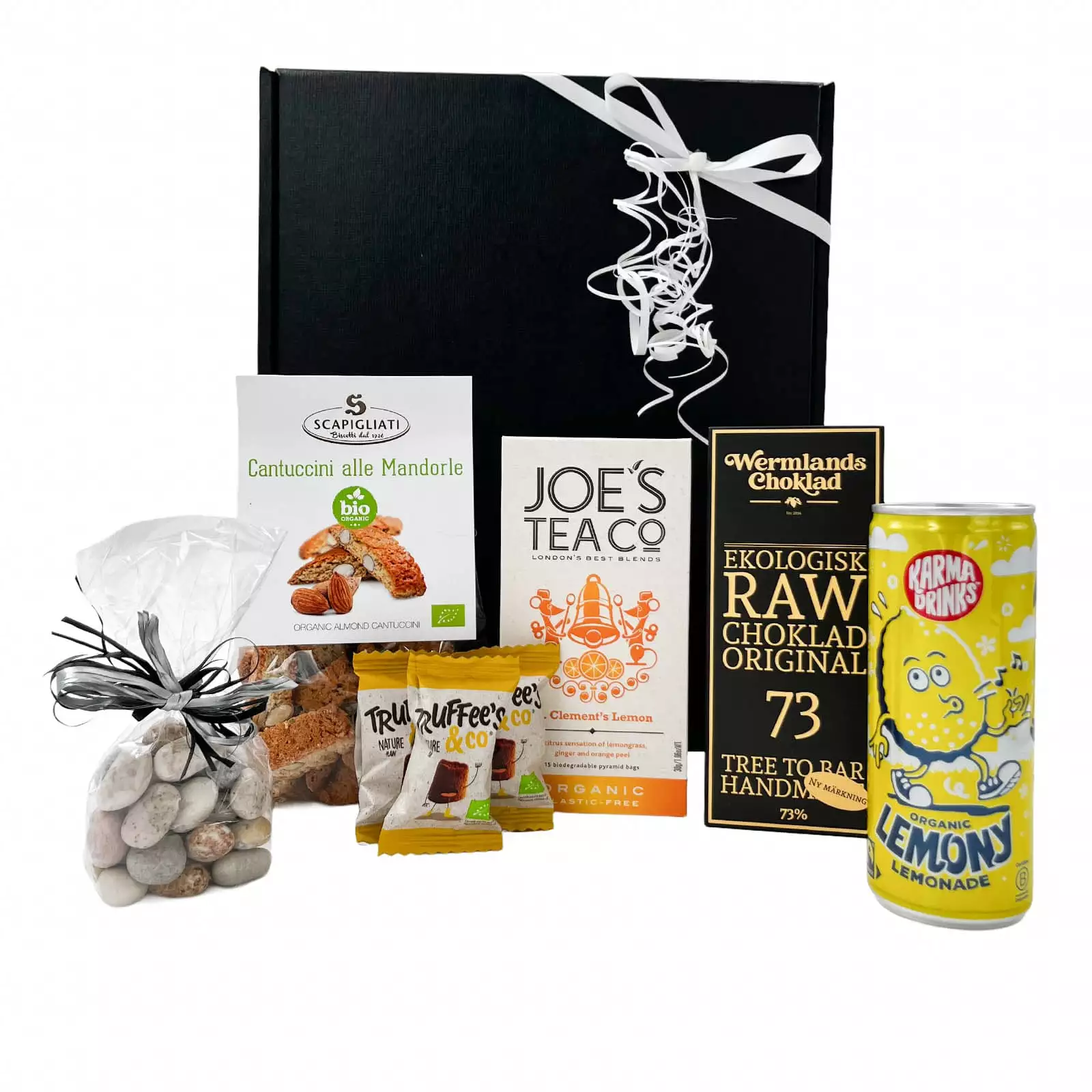 En presentlåda fylld med enbart ekologiska godsaker: mörk rawchoklad, örtte med citrongräs, ingefära och citrus, fransk tryffel, italienska mandelcantuccini, lakritsstenar och frisk prisbelönt citronlemonad. Perfekt som gåva till den som uppskattar hållbara delikatesser.
