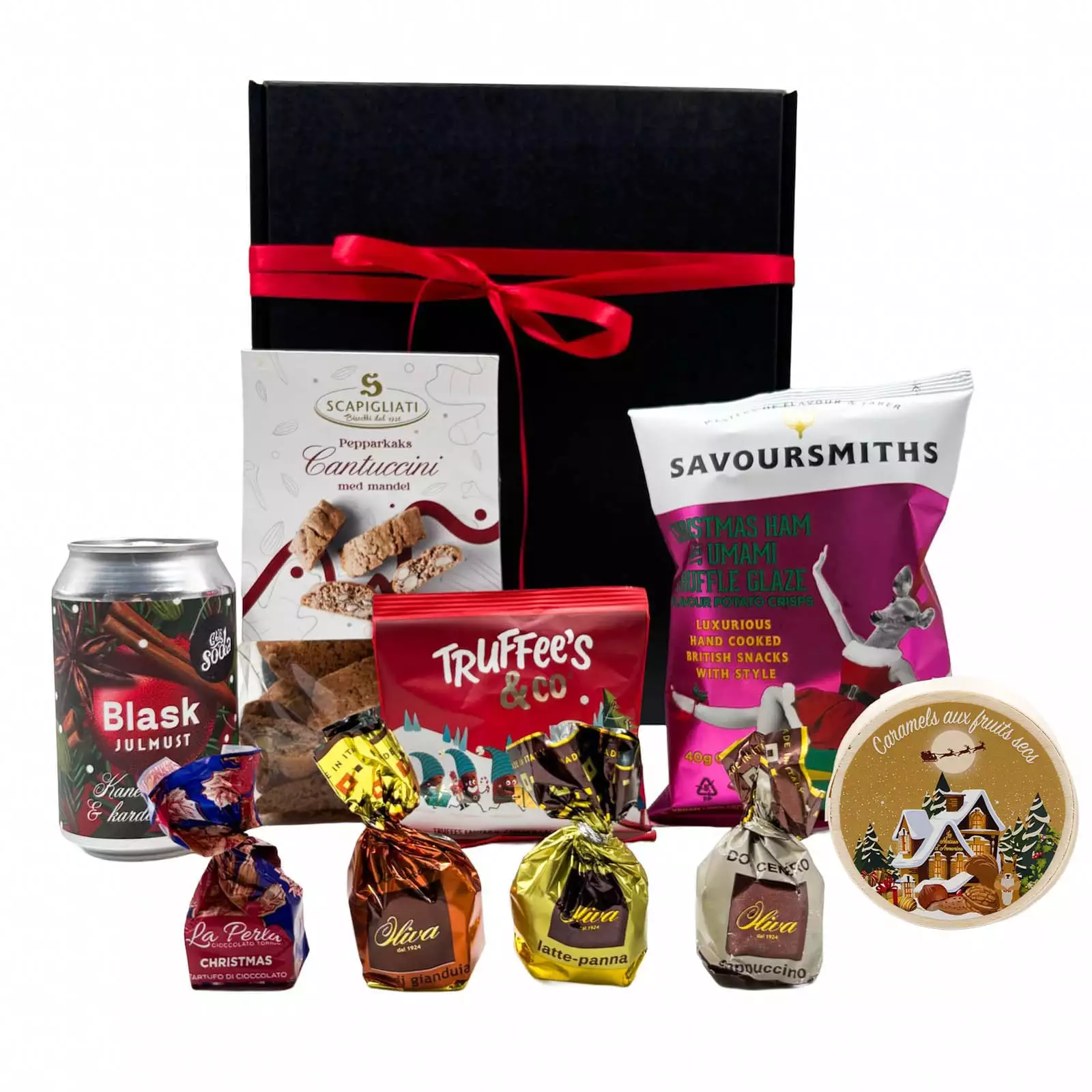 En julig presentlåda fylld med tryfflar, kola & julmust är en stämningsfull blandning av sött, salt och klassiska julsmaker. Här samsas chokladtryfflar, smörkola och praliner med pepparkakscantuccini, chips med julsmak och den populära Blask julmusten – utsedd till bästa julmust 2024 av 61 sorter av öl- och smakbloggaren Robert Andersson.