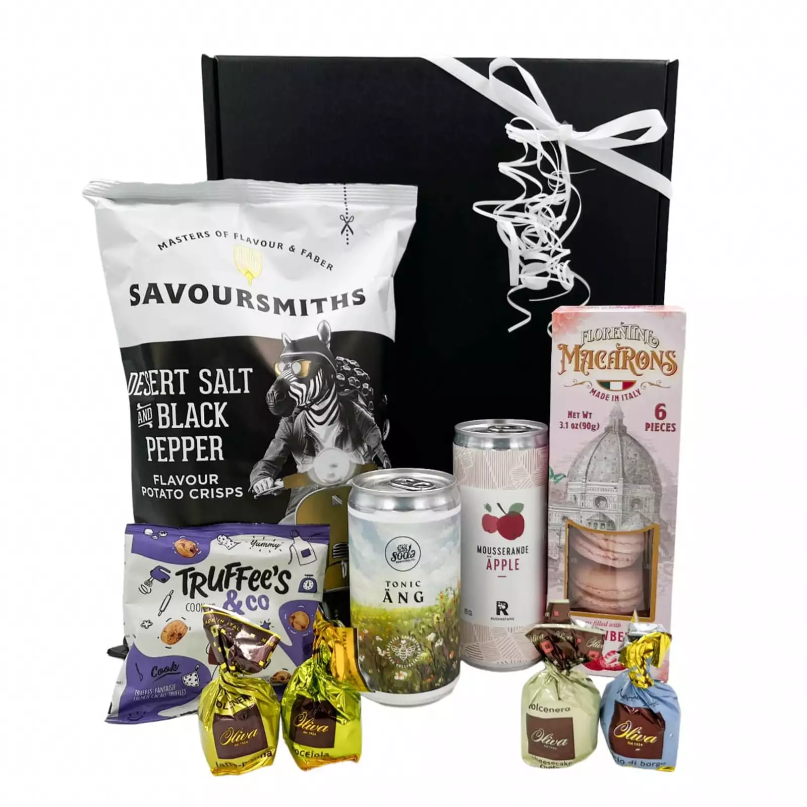 Elegant delikatesslåda med mousserande äppelmust, svensk tonic med smak av äng, lyxiga chips, franska tryfflar, italienska macarons med smak av jordgubb och chokladpraliner - en smakfull kombination av sött, salt och bubbligt.
